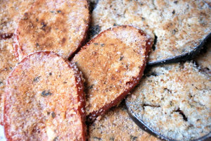 Passare le fette di verdura nel pane, comprimendo con il palmo della mano in modo che entrambi lati siano ricoperti da un sottile strato. Cuocere le fette in padella a fuoco vivo e con il coperchio scostato, e rigirare in modo che entrambi i lati siano ben cotti con il pane che comincia a rosolarsi.